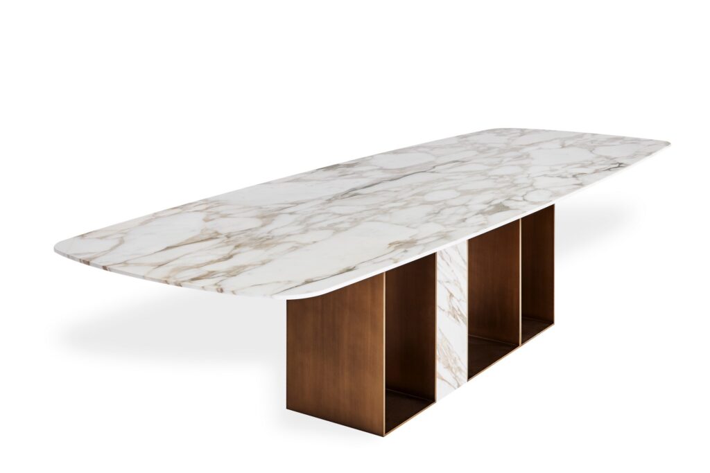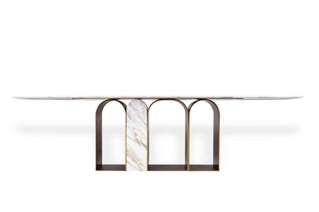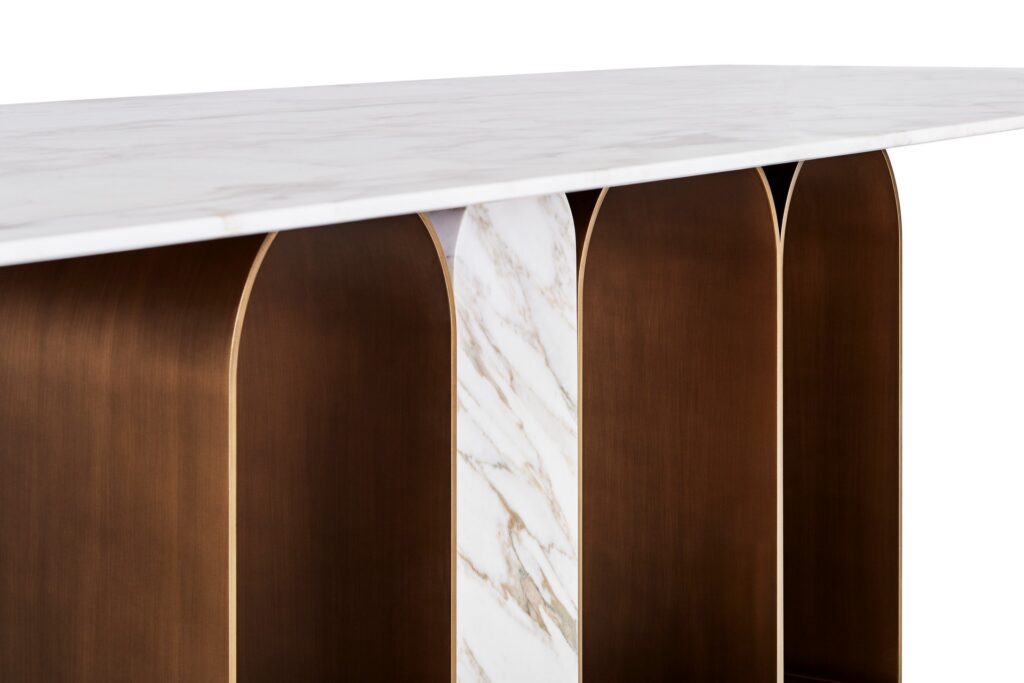 Collection of tables characterized by a sculptural base whose sinuous shapes recall the typical arches of Brazilian modernist architecture, from the buildings built on the plateau of Brasilia (the Planalto Central), to the outskirts of Milan. The bases are made up of modular elements, which allow you to create tables of different lengths. They are made with top and solid base in marble in different finishes, and brushed metal structure.